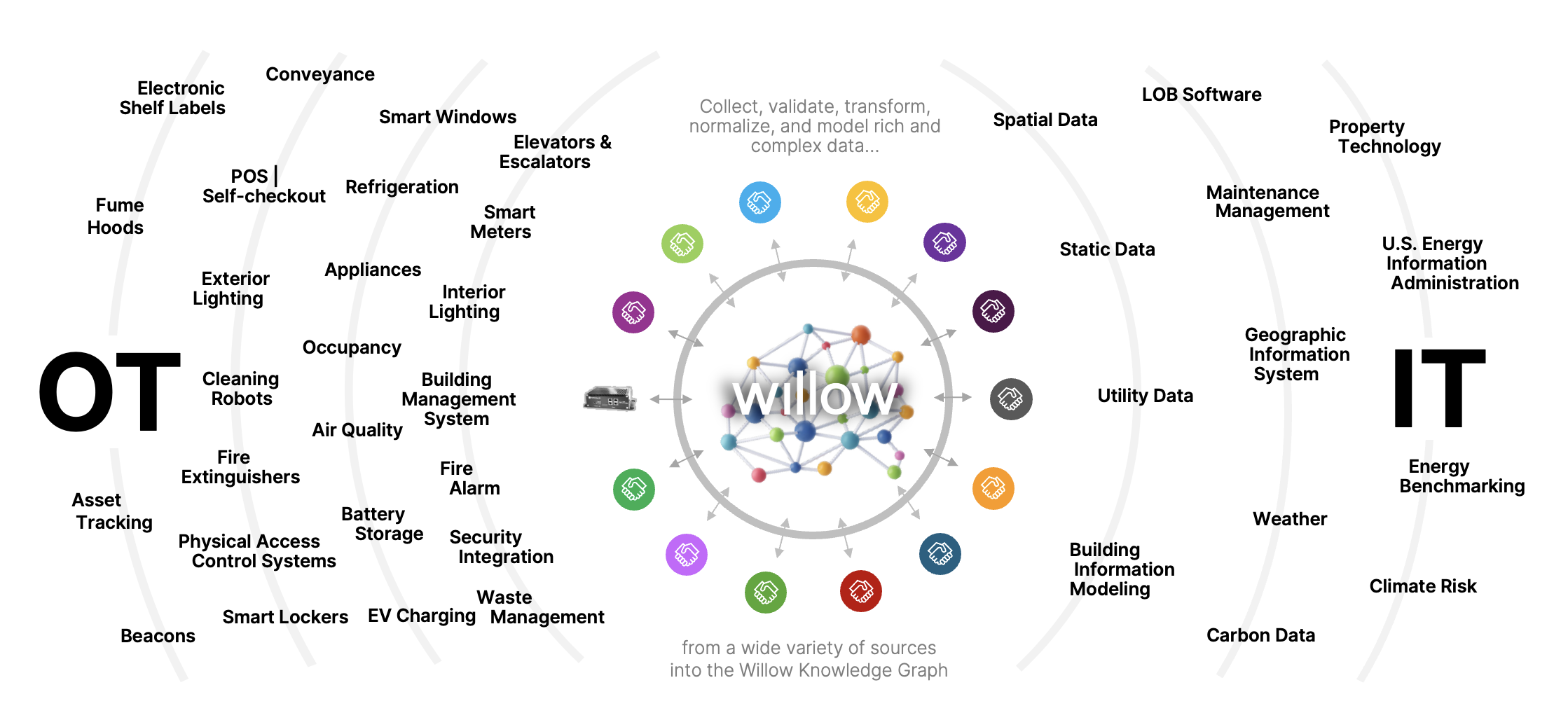 This data is useful, but there’s a big problem: it’s all siloed. It’s fragmented across departments, vendors, and systems. IT owns digital systems like enterprise applications like ERP and Maintenance Management (CMMS), cloud infrastructure, and cybersecurity. OT runs physical operations for Building Management/HVAC, access control, elevators, and energy systems. Both generate immense volumes of useful data. But without a shared language or framework, this data lives on separate islands, limiting its ability to drive intelligent action.