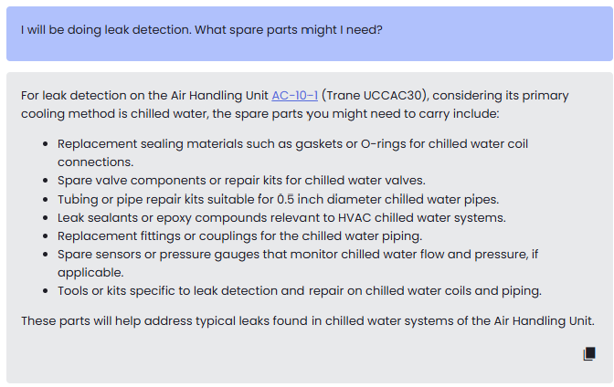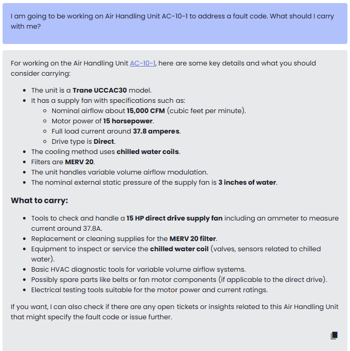 Before heading out, Terry wants to be prepared. He decides he wants to learn a bit more about the affected AHU. He also wants to know upfront what tools and spare parts he should carry with him on his visit so he can save himself a second trip.